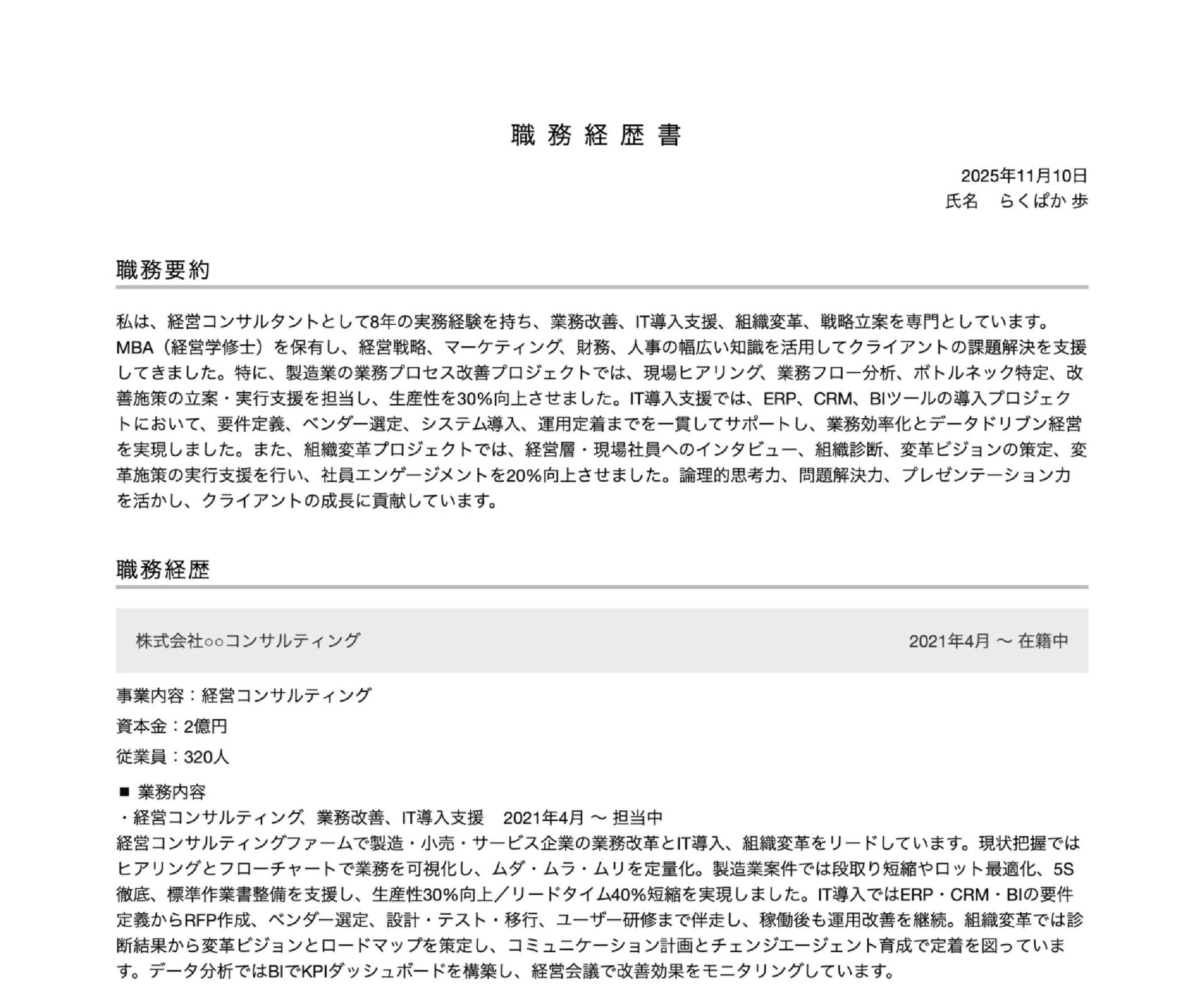 職歴では、在籍期間や雇用形態だけでなく、担当したプロジェクトや役割、成果を具体的に記載します。コンサルタント職では、クライアントへの提案実績や改善施策の成果、売上改善率やコスト削減率など、数字で示せる結果があると説得力が増します。
