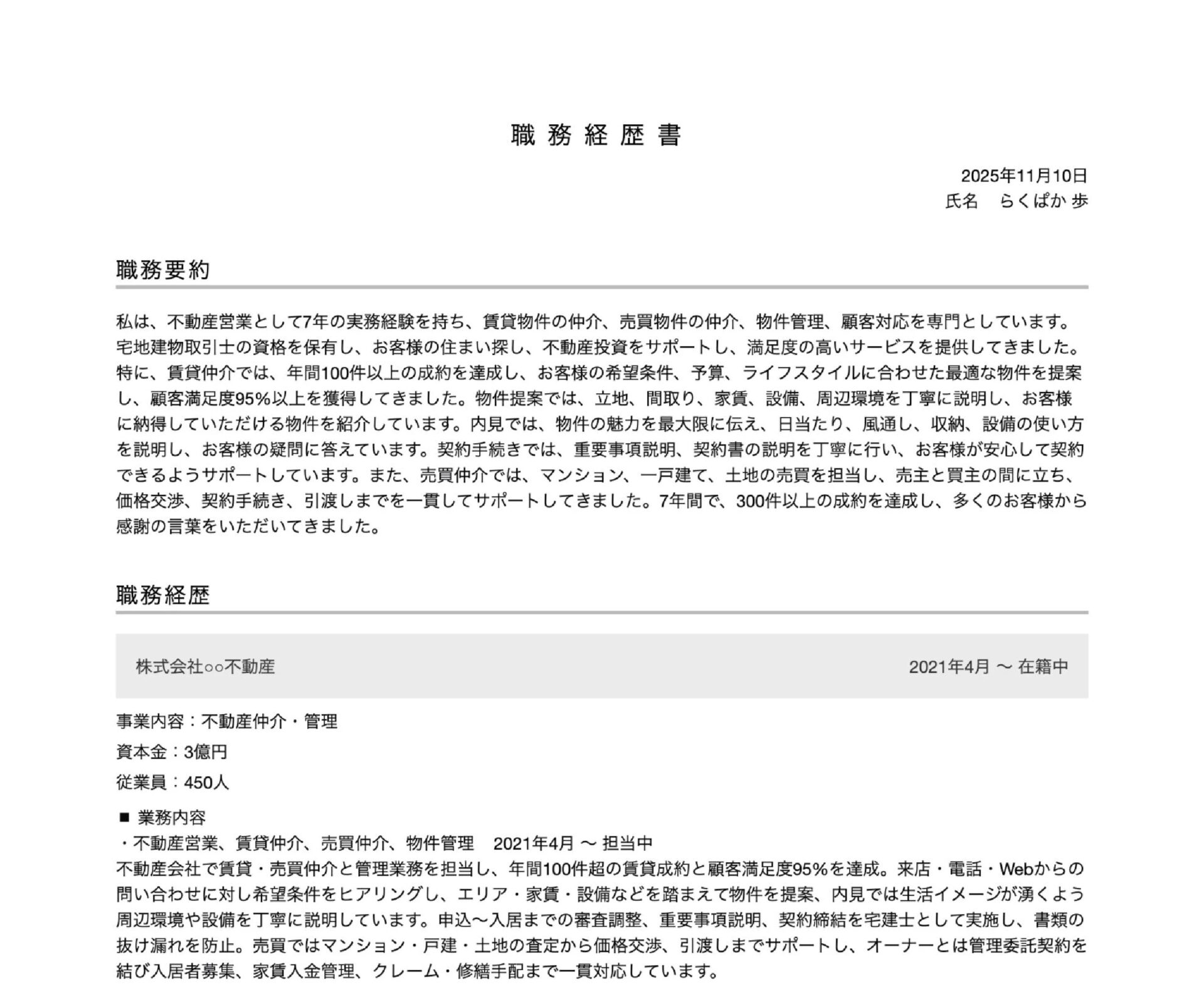 職務要約は、AIが職歴をもとにして自動生成してくれます。不動産関連職では、担当してきた物件の種類や取引規模、営業成績などを盛り込むと、経験の深さや実績が伝わりやすくなります。生成後は文章の正確性やトーンを確認し、必要に応じて調整しましょう。