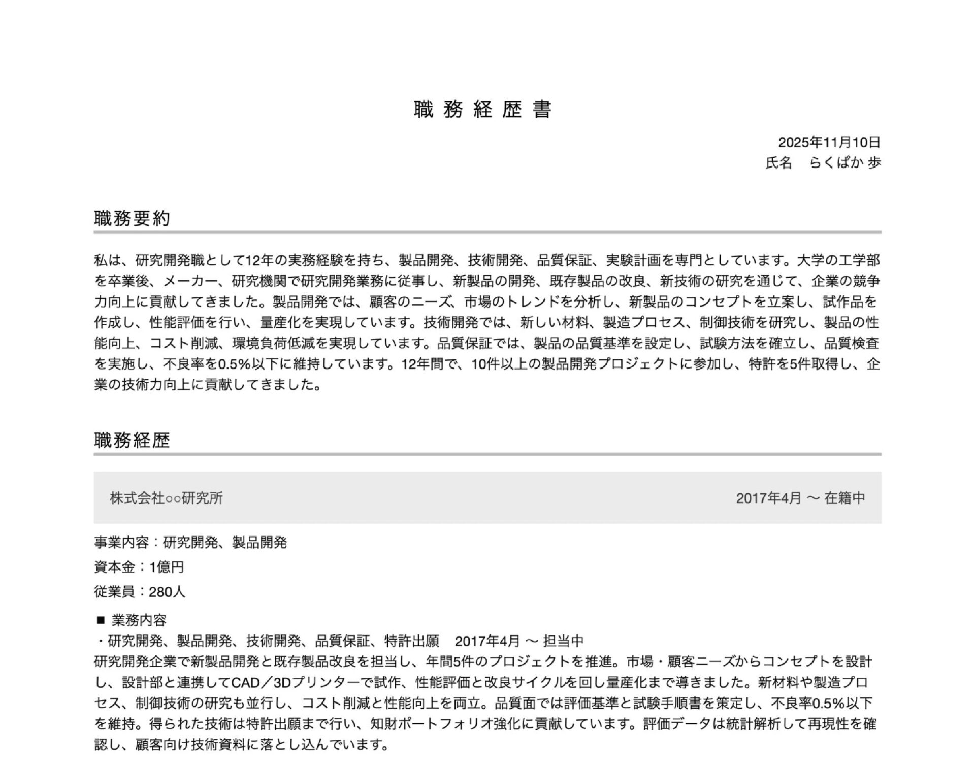 らくらく履歴書で作成した、研究・開発職の職務経歴書の例を見てみましょう。実験や分析の成果に加え、改善の提案といったプロセスも重視されます。