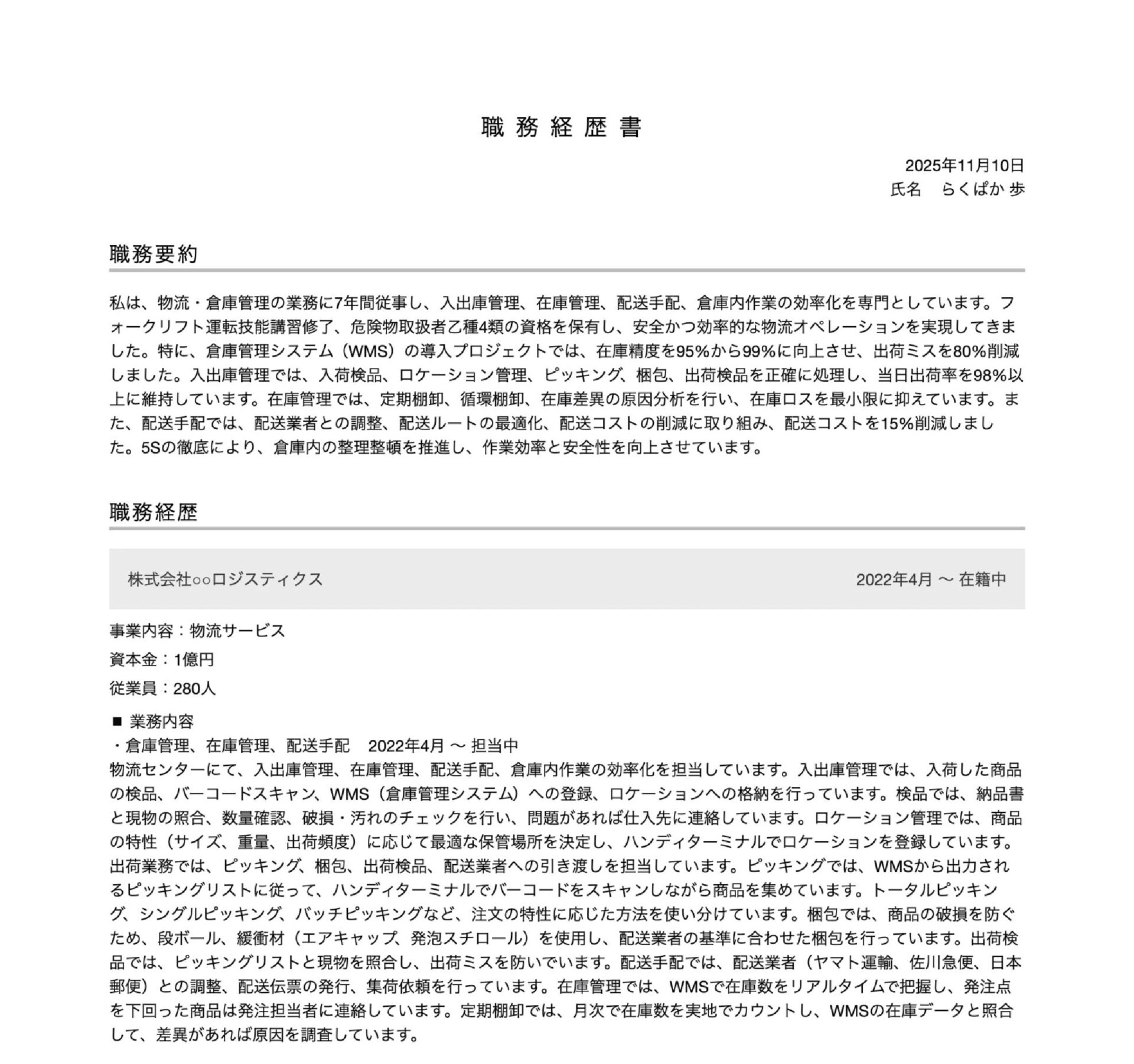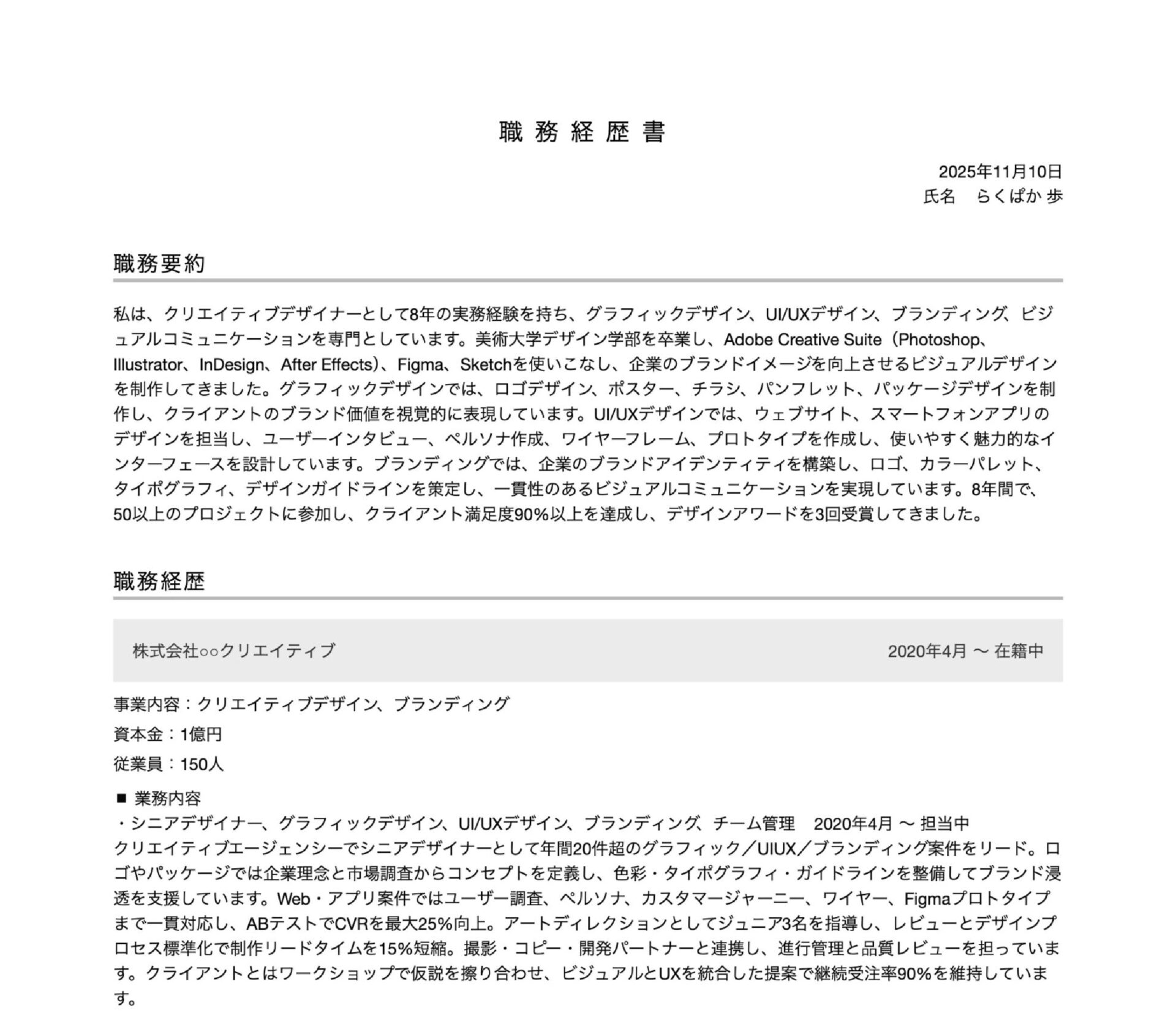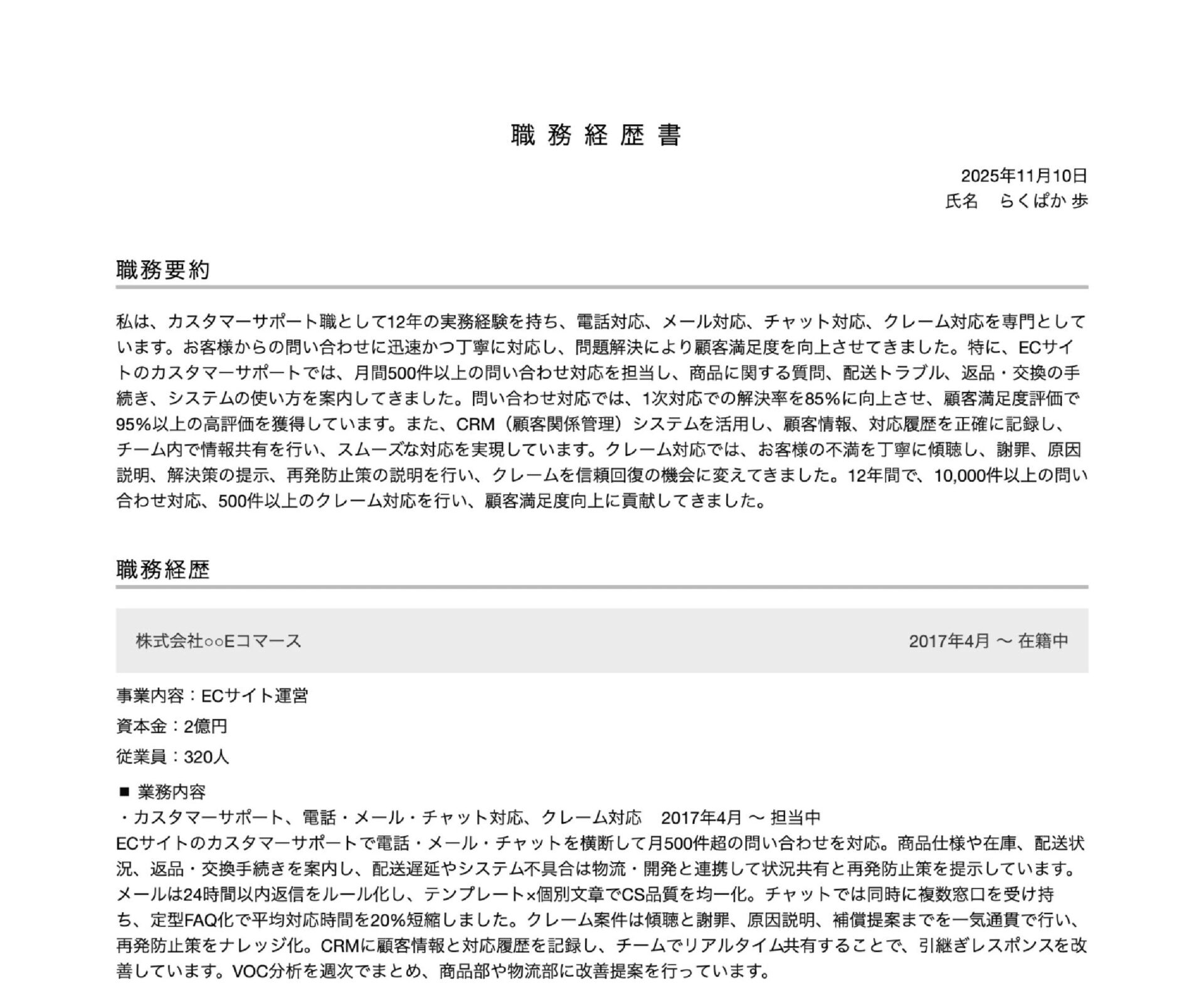 らくらく履歴書でカスタマーサポート職の職務経歴書を作成した場合の例です。